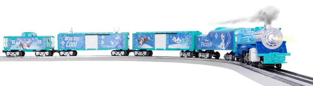 Climb aboard for a frozen adventure with Disney's Olaf and Sven on our Disney Frozen Olaf train set! This whimsical set is decorated in icy blue colors and graphics of two beloved pals, Olaf and Sven, from Disney's Frozen as they have fun in the snow! Included in this set is a LionChief steam locomotive and tender, boxcar, bobbing car with Olaf and Sven peeking out as the train goes around, caboose, and all the track and power you need to get your train up and running! © Disney