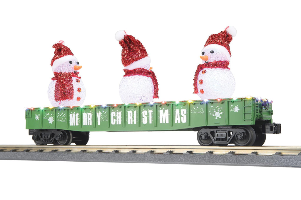 These O Gauge Christmas-inspired gondola cars are certainly no coal haulers! Brightly painted and adorned with body-clad LED Christmas Lights, each car contains lighted Snowmen that blink and change colors whenever they're switched on. These are certain to be real attention getters on your Holiday Christmas Train!