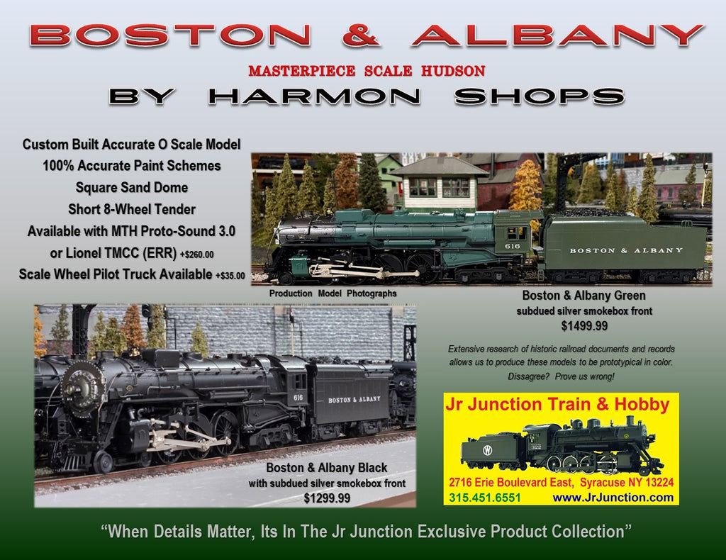 This special customized Boston & Albany J2 Hudson steam locomotive model is a first in a series produced in close collaboration with Harmon Shops and Jr Junction Train & Hobby. This landmark masterpiece has never been produced this accurately in O scale until now. Available in several command control configurations and decoration it is produced for and only available in the Jr Junction Train & Hobby Exclusive Product Collection. Amongst many other exclusive features, this model accurately includes a prototypical square sand dome and short 8-wheel tender.